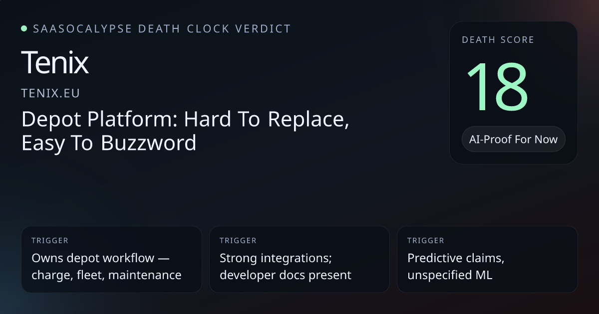 Owns depot workflows (charging + scheduling + maintenance) rather than a thin assistant layer — multi-module Tenix Charge/Fleet/Maintenance signals operational depth.High switching costs implied by depot data, schedules, historical maintenance records and bespoke integrations with planning/timetables.Enterprise posture: SLA compliance, public transit/operator customers and multi‑depot tooling suggest procurement and reliability gates.