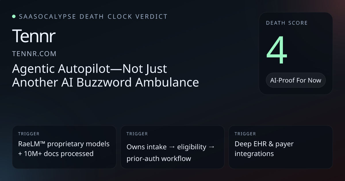 -4 Relative PlacementSmall downward tweak — Tennr feels slightly safer than its score implies due to real integrations, proprietary data/models and switching costs, though marketing language and hidden pricing warrant modest caution.