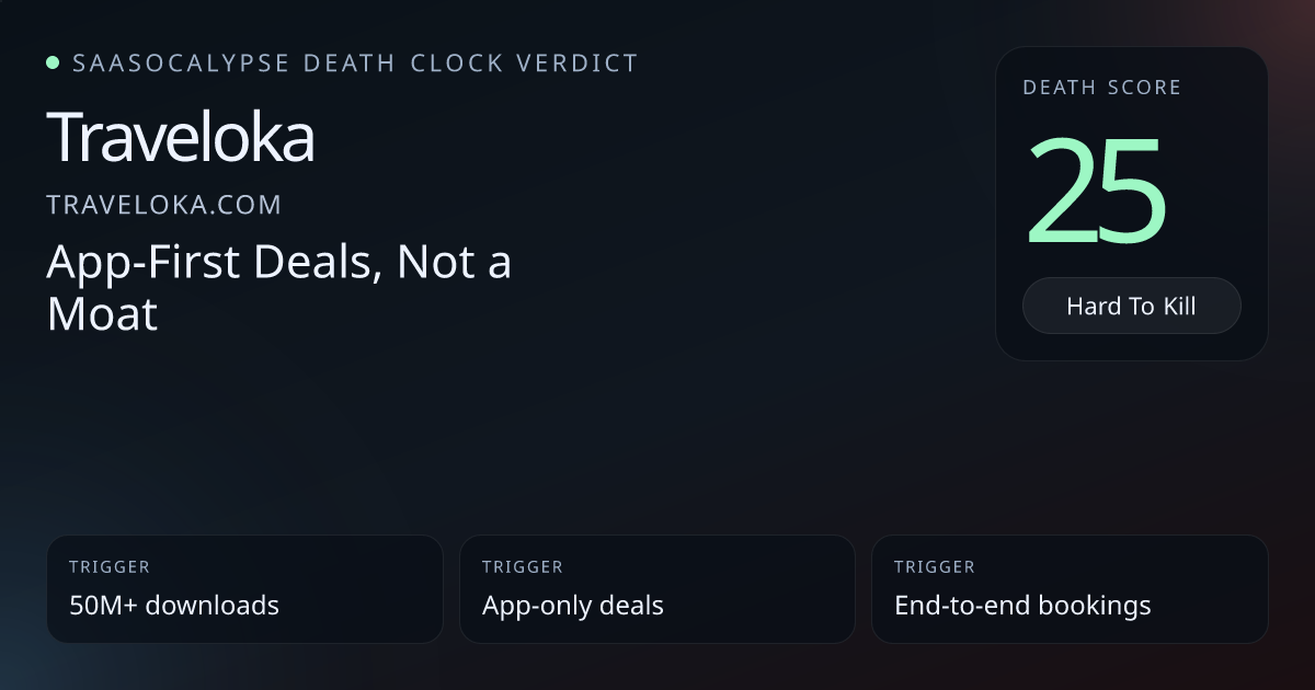 -6 Relative PlacementModestly less vulnerable — Traveloka's genuine end-to-end booking workflow, large consumer distribution, direct integrations and live monetization give it stronger defenses than the peer set of easily‑cloned wrappers, though commoditized messaging keeps some risk.
