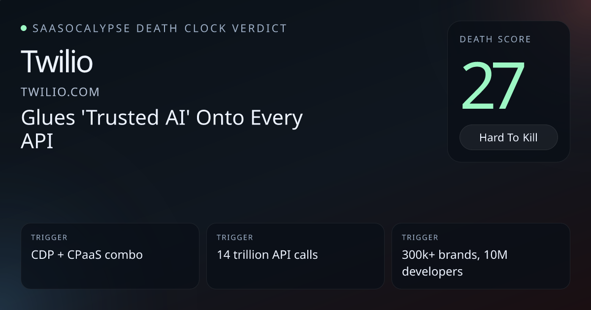 -4 Relative PlacementLower by a few points — Twilio's deep workflow ownership, scale, and enterprise locks outweigh marketing‑forward AI phrasing, so it's slightly less vulnerable than a 31 suggests.