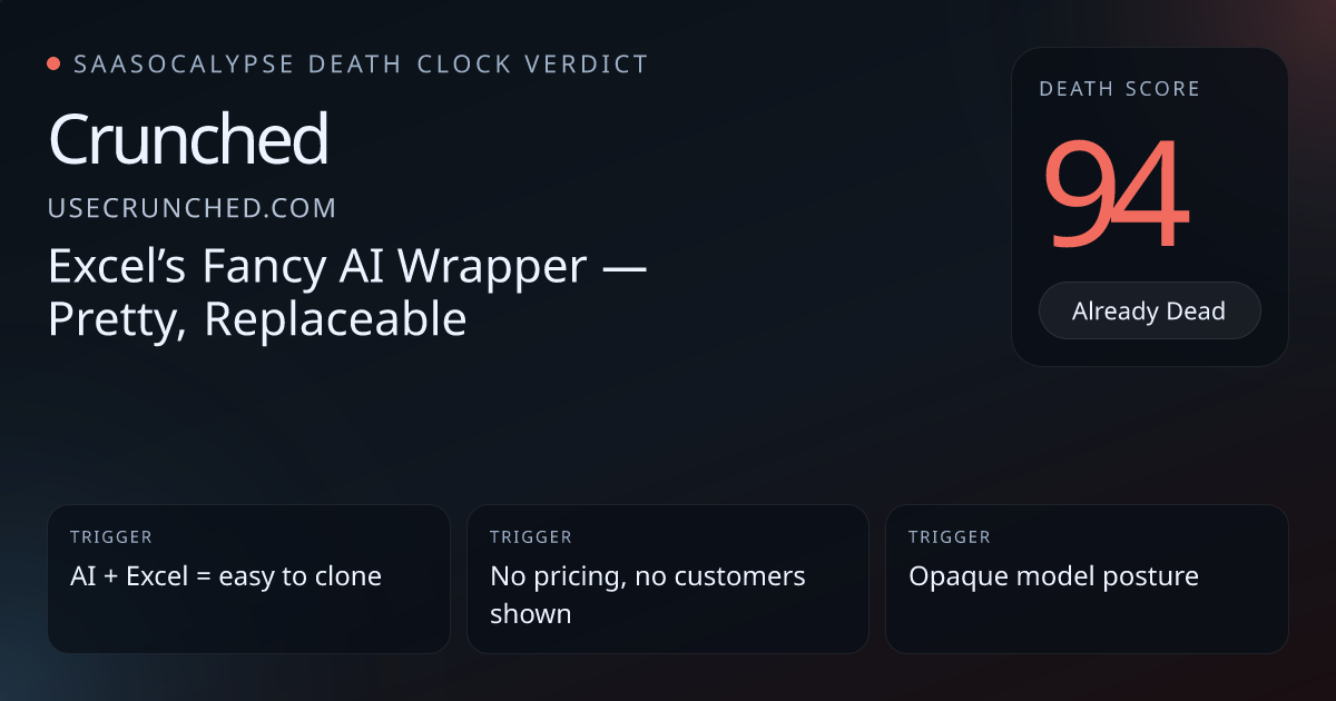 Peer ai_wrappers Anything (88) and SaaSocalypse (92) cluster below Crunched's 100 — prefer anchoring to that range.Site shows only headline 'AI Excel Analyst' and an explicit Excel mention; no integrations, pricing, customers, or enterprise signals.High commodity and model‑dependency flags are real but typical for ai_wrappers and not by themselves proof of terminal collapse.