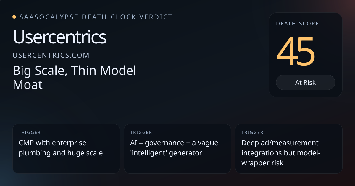 Peer cluster of vertical_workflow companies sits ~46–50 (At Risk); current 41 is an outlier on the safe side.Defensive signals are strong: extensive integrations (CMS, ad/measurement), server‑side tracking, cross‑device consent, consent logs, reported scale (2.4M sites, 8.8B consents) and enterprise features (SLA, CSM) increase switching costs.Risk signals are meaningful: commodity language ('automate privacy compliance', 'intelligent generator') and MCP positioning as a governance/front‑end rather than owning models suggests reliance on third‑party LLMs and re‑skinnable features.