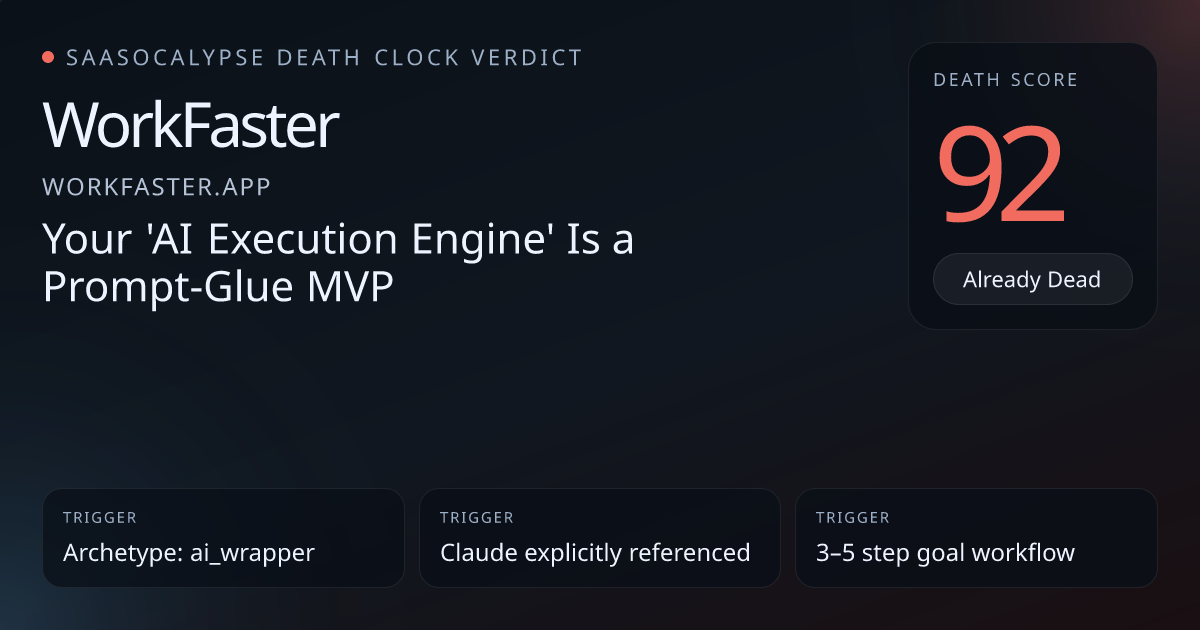 Peer ai_wrapper cluster at 88–94 (Monica 88, Anything 88, OpenClaw 90, Crunched 94) — 100 is an outlier versus comparable products.Explicit third‑party model dependency (mentions Claude) and commodity language ('AI execution engine', 'Ready‑to‑Use Prompts') strongly drive vulnerability.No enterprise signals, limited distribution (private beta/waitlist), hidden pricing, and no customer proof increase replaceability.