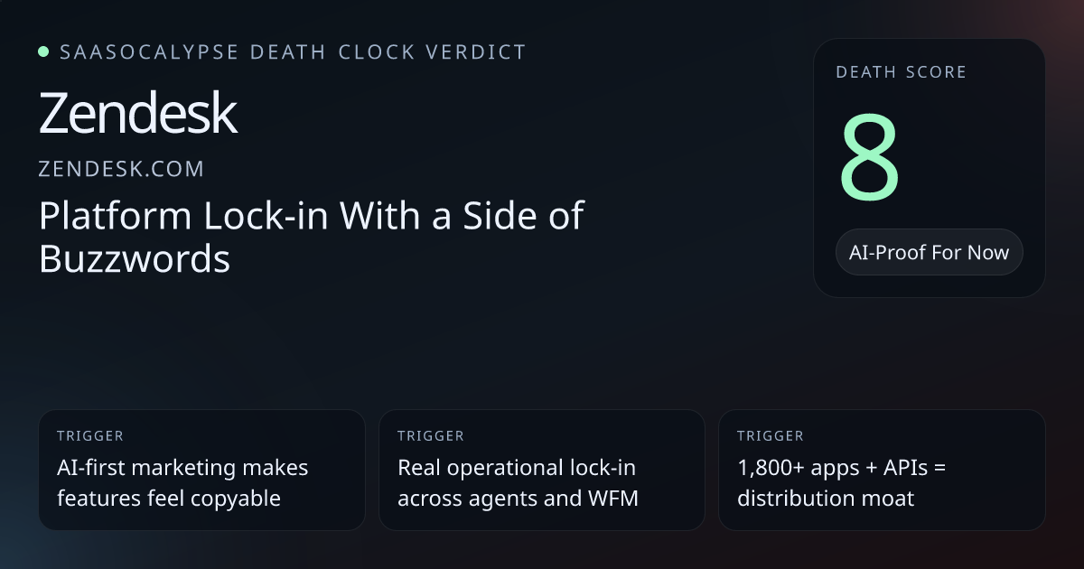 Heavy 'AI-first' / Copilot language and automation headline claims increase copyable feature risk ('Automate 80%+ of interactions', 'AI‑first service platform').Model‑dependency cues (Forethought integration, 'self‑learning for any stack') imply pluggable models rather than an undisclosed proprietary foundation‑model moat.Defensive signals (ticketing, WFM, QA, knowledge, 1,800+ apps, 100k+ customers) create meaningful switching costs and entanglement, limiting downside magnitude.