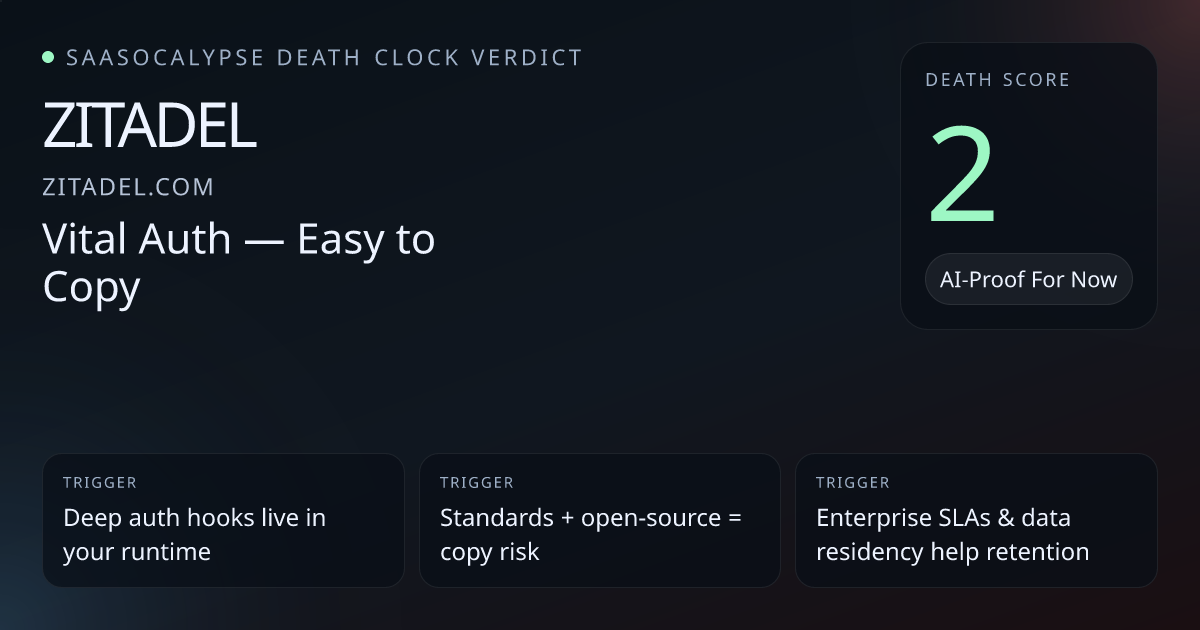 Open-source, API-first positioning (≈4k GitHub stars, 50+ contributors) lowers bar for replication or cloud-hosted forks.Commodity language ("Identity infrastructure, simplified", "All-in-one identity suite") and standards-based protocols (OIDC/SAML/OAuth) make functionality portable to incumbents or cloud features.Critical runtime placement — hosted login pages, OIDC/OAuth endpoints, Actions executed during auth flows — creates real switching friction and integration lock-in.