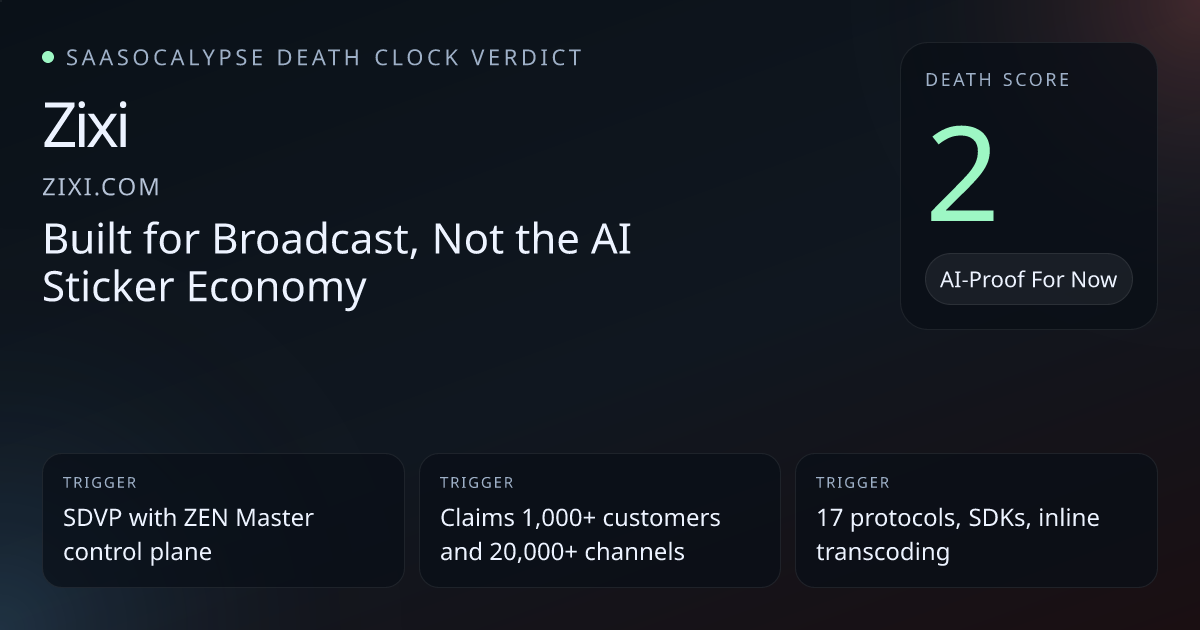Strong defensive signals: ZEN Master control plane, high channel counts (>20k), OEM partners, and SOC2/pen-test posture — argues for infra depth and high switching costs.AI appears only as a feature-level 'AI-driven quality scoring' with no model provenance or vendor dependence — a weak but nonzero AI signal that can be rewrapped.Commodity language on the site ("Global Leader", "The best streaming software") increases risk of copycat positioning and vendor marketing creating perceived parity.