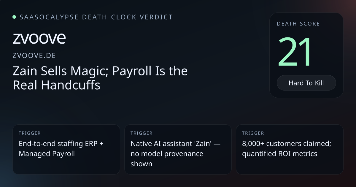 -4 Relative PlacementSmall downward tweak — zvoove’s operational lock‑in (managed payroll, end‑to‑end workflows, compliance) makes it a bit safer than the current score implies despite headliney AI marketing.